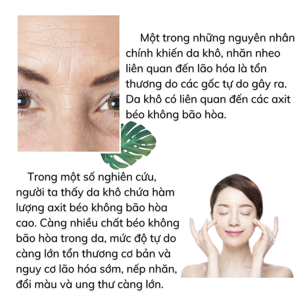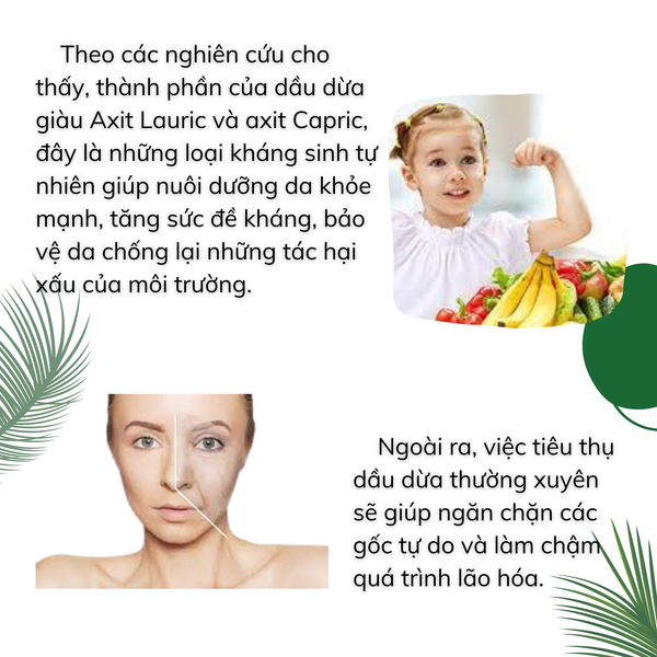 Chống lão hóa: Dầu dừa giàu vitamin E và các chất chống oxy hóa giúp làm chậm quá trình lão hóa, hạn chế nếp nhăn và tăng độ đàn hồi cho da.