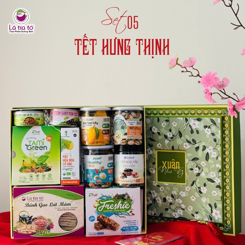 Từ ngũ cốc Tami Green, hạt mix và hạt dẻ cười Mỹ, đến mật hoa dừa cô đặc, cơm mix dinh dưỡng và sườn chay xào sa ớt… tất cả kết hợp thành một set quà sang trọng nhưng vẫn mang tinh thần thực dưỡng hiện đại.