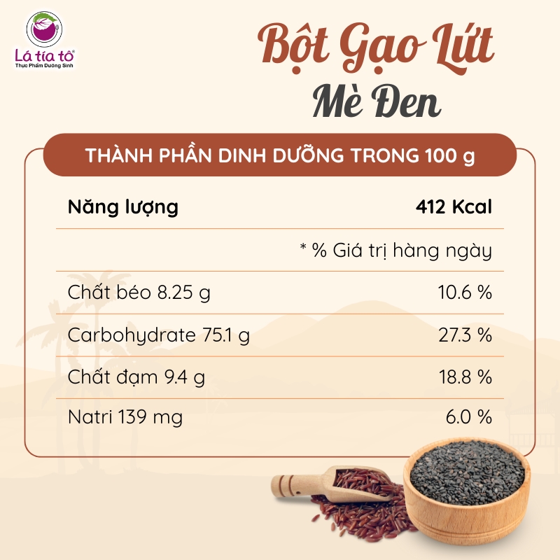 Bột Gạo Lứt Mè Đen là dòng sản phẩm thực dưỡng cao cấp đến từ thương hiệu Lá Tía Tô, được chế biến hoàn toàn từ nguyên liệu tự nhiên, không chất bảo quản, không hương liệu nhân tạo. Sự kết hợp giữa gạo lứt đỏ nảy mầm và mè đen mang lại nguồn dinh dưỡng dồi dào, dễ tiêu hóa, phù hợp với mọi đối tượng – đặc biệt là người theo chế độ thực dưỡng, người ăn chay, người tiểu đường hoặc người đang phục hồi sức khỏe.