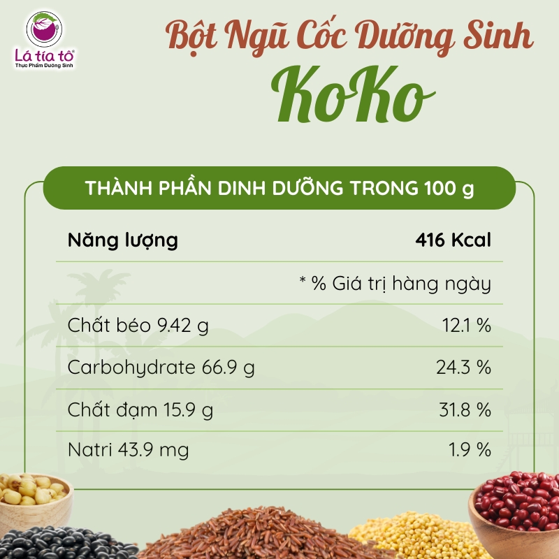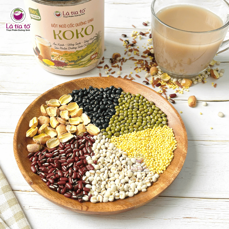 KOKO là sản phẩm bột ngũ cốc dưỡng sinh từ thương hiệu Lá Tía Tô, được chế biến từ 11 loại hạt nảy mầm, theo phương pháp thực dưỡng Ohsawa. Không chỉ là nguồn thực phẩm lành mạnh, KOKO còn là lựa chọn lý tưởng để nuôi dưỡng cơ thể, hỗ trợ tiêu hóa và giữ gìn sức khỏe bền lâu.