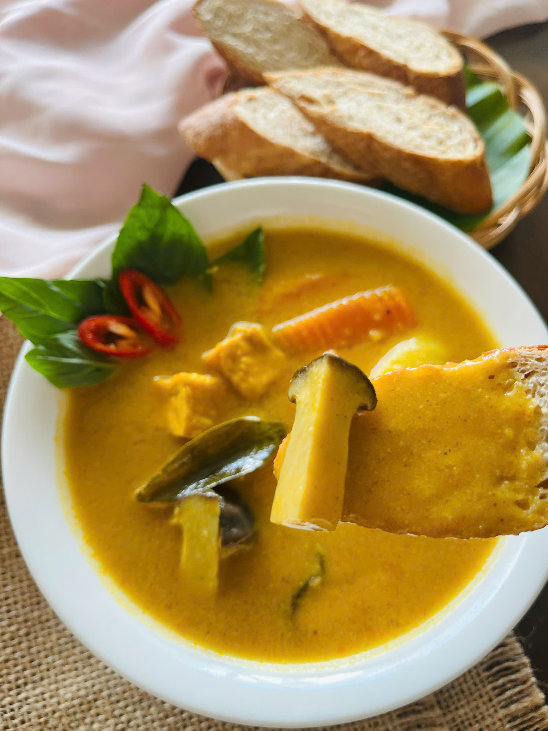 Hãy thử ngay món cà ri chay từ Bếp Lá Tía Tô! Với hương thơm đặc trưng từ sả, vị béo dịu của nước cốt dừa hòa quyện cùng vị ngọt tự nhiên của rau củ, món ăn này chắc chắn sẽ làm hài lòng cả gia đình.