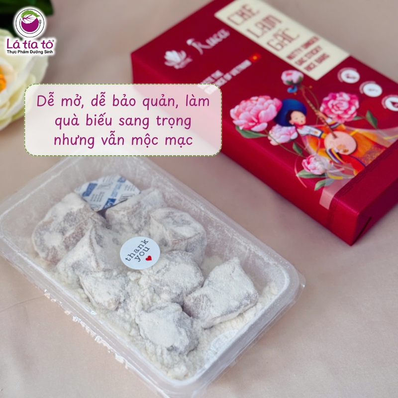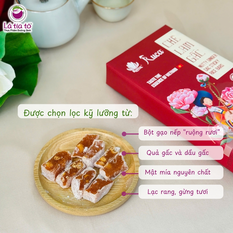 | Thành phần | Bột gạo nếp Ruộng Rươi, gấc quả, dầu gấc, mật mía, lạc, gừng tươi. |
