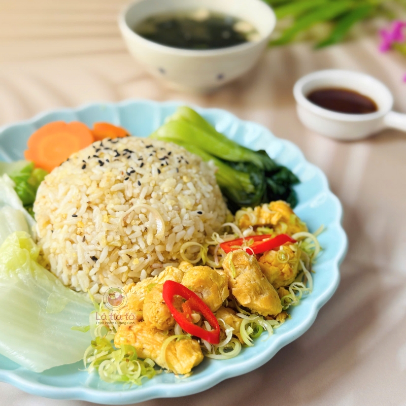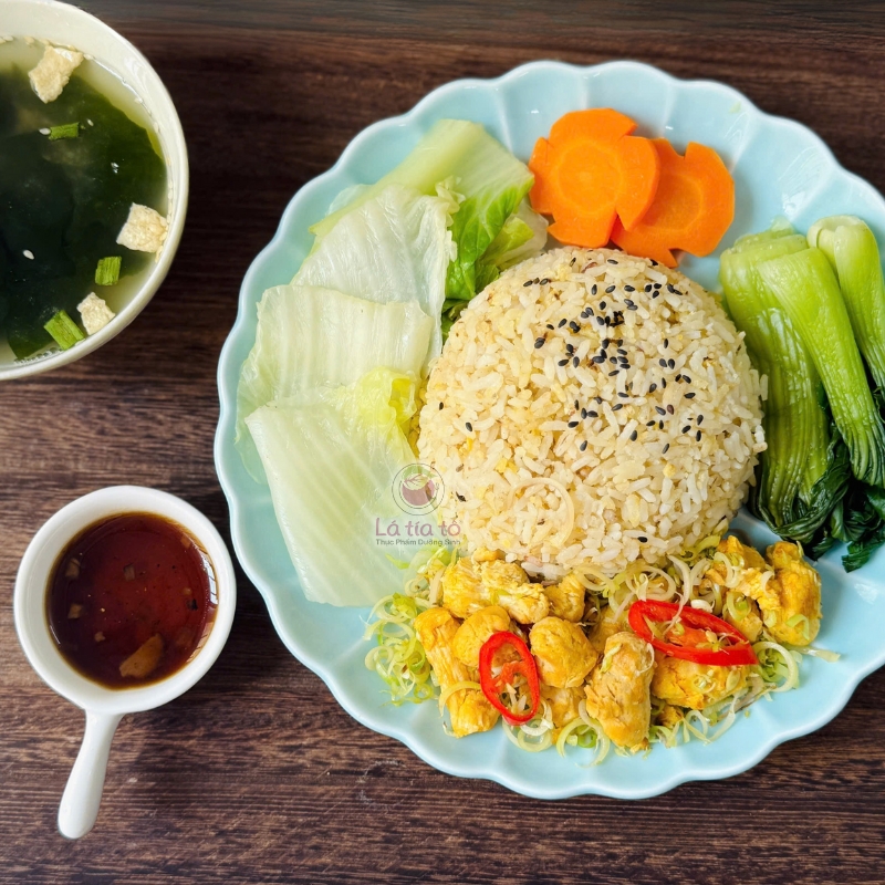 | Thành phần | Cơm gạo lứt xát dối đậu lăng, đạm lúa mì xào sả ớt, rau củ luộc thập cẩm chấm kho quẹt, canh rong biển |