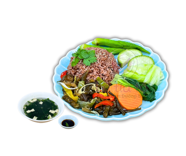 Cơm gạo lứt, tảo xoắn , ớt chuông, rau củ luộc thập cẩm chấm kho quẹt, canh rong biển |