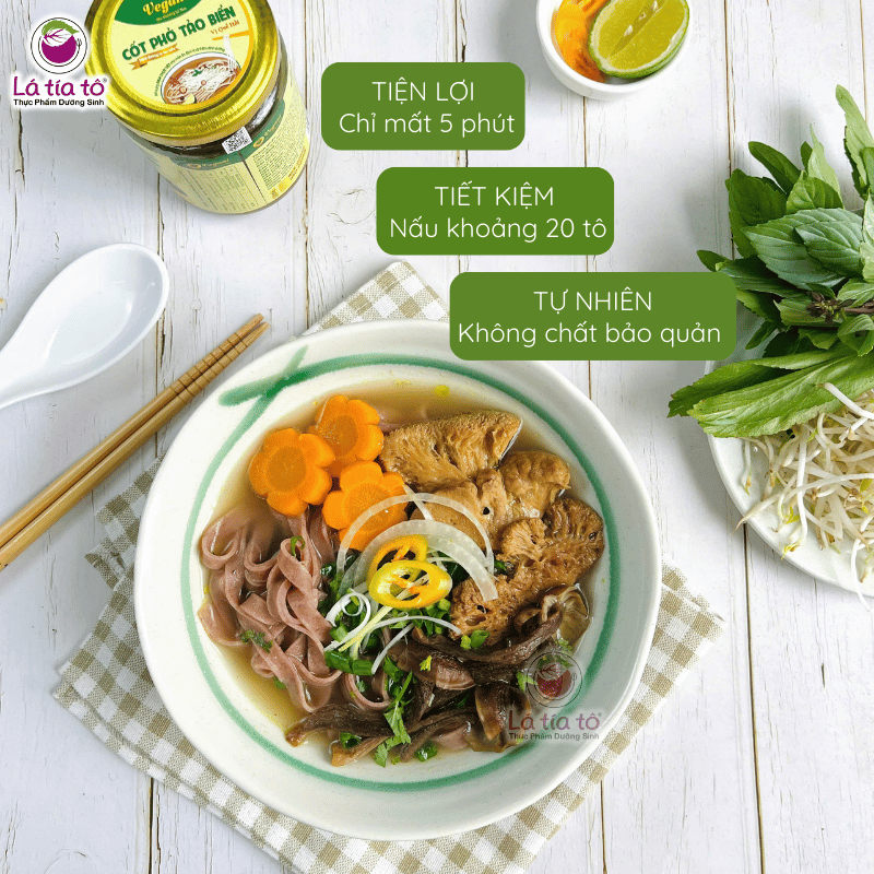 Thành phần | Tảo biển ( 10%), nấm đông cô, ngưu báng, củ cải, cà rốt, sả, quế ( 1% ),hồi( 1% ), thảo quả, nêm thuần chay, mắm thuần chay, muối, dầu thực vật. |