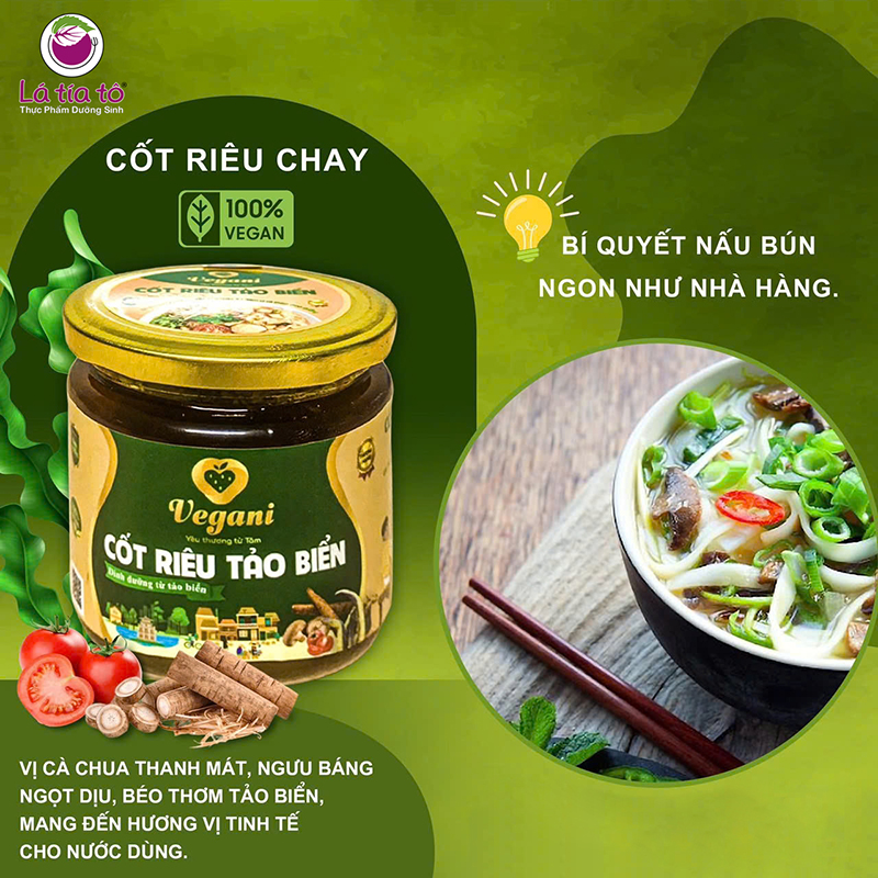 | Thành phần | Tảo biển( 10%), nấm đông cô, ngưu báng, cà chua, ớt, cà rốt, sả, gừng, nêm thuần chay, nước, muối, dầu thực vật. |