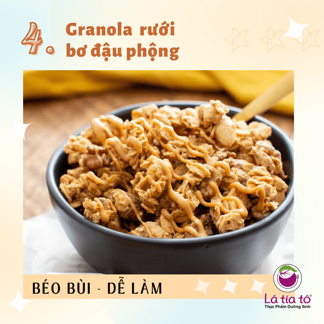 - Granola các bạn có thể tự làm ở nhà hoặc mua sẵn. Sau đó rưới bơ đậu phộng nguyên chất để ăn kèm tạo thêm độ beo béo cho món ăn khoái khẩu này. Hoặc dùng nước sốt bơ đậu phộng theo công thức nước sốt salad ở trên.