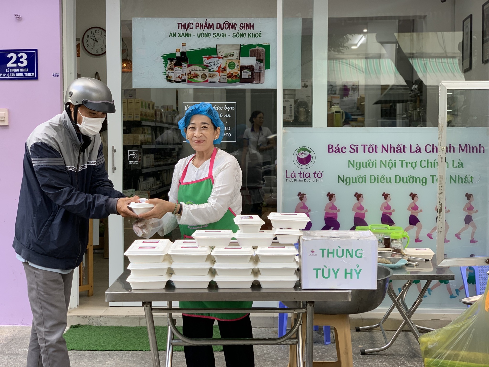 Gia đình Lá Tía Tô chúng mình phát tâm gieo duyên ăn chay cùng mọi người, phát món chay tuỳ hỷ (như cơm, cháo, bún trộn, miến xào, ... tuỳ vào từng kỳ mà bếp nhà mình sẽ làm một món khác nhau) vào những ngày 14, 15, 30 và mùng 1 hàng tháng, từ 10g00 đến 12g00 tại hai chi nhánh Số 3 Hoa Sứ, Quận Phú Nhuận, Tp.HCM và Số 23 Lê Trung Nghĩa, Quận Tân Bình, Tp.HCM. Bạn thương mến, tiện đường đi làm ghé ngang mời bạn mang về dùng nhé.
