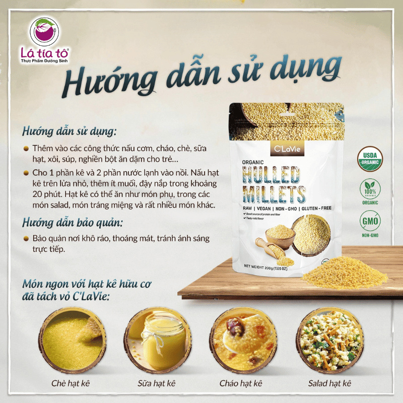 Hạt kê hữu cơ tách vỏ C’LaVie được lựa chọn từ những hạt kê chất lượng cao, trồng và chế biến theo quy trình hữu cơ an toàn, không hóa chất bảo quản, đảm bảo giữ trọn dinh dưỡng tự nhiên và hương vị thuần khiết.