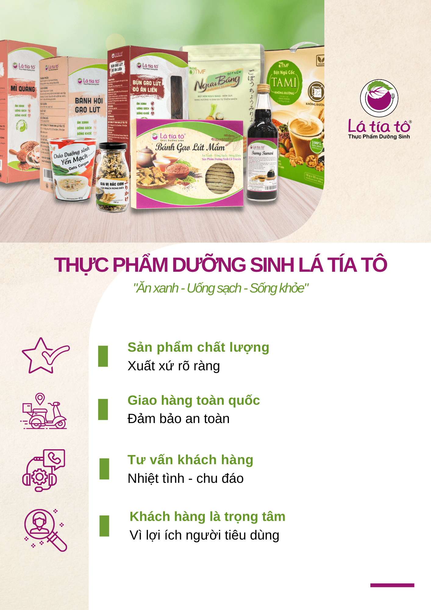 Chúng tôi là Chay Thực Dưỡng Lá Tía Tô – một thương hiệu chuyên tâm làm ra những sản phẩm thuần chay, sạch lành và đậm tinh thần thực dưỡng Việt. Chúng tôi tin rằng, ăn đúng - sống đúng thì sức khỏe và sự an yên sẽ trở lại tự nhiên như vốn có.