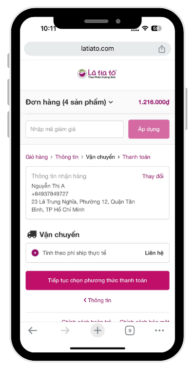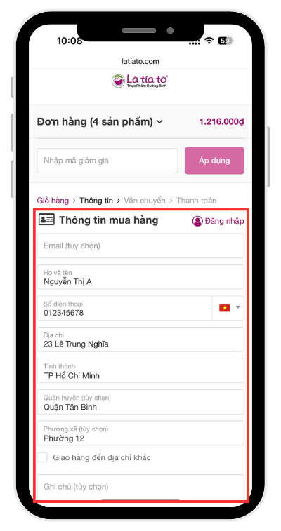 Điền đầy đủ các thông tin mua hàng theo các bước trên website, có thể thêm ghi chú cho Lá Tía Tô nếu có.