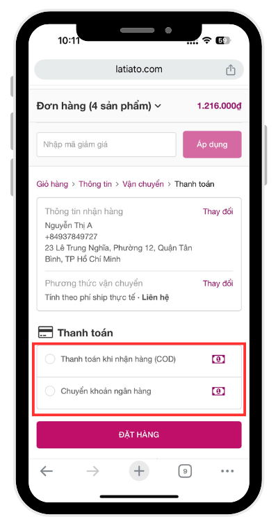 4. Nhập thông tin giao hàng, vận chuyển, thanh toán
