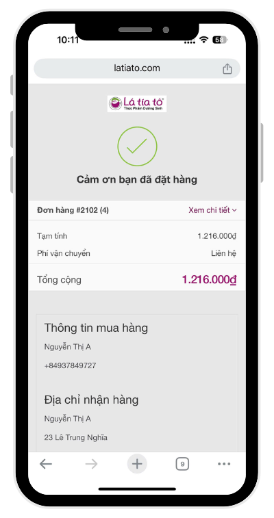 + Sau khi đặt hàng thành công, Lá Tía Tô sẽ liên hệ quý khách để xác nhận phí ship thực tế và hoàn tất thủ tục.