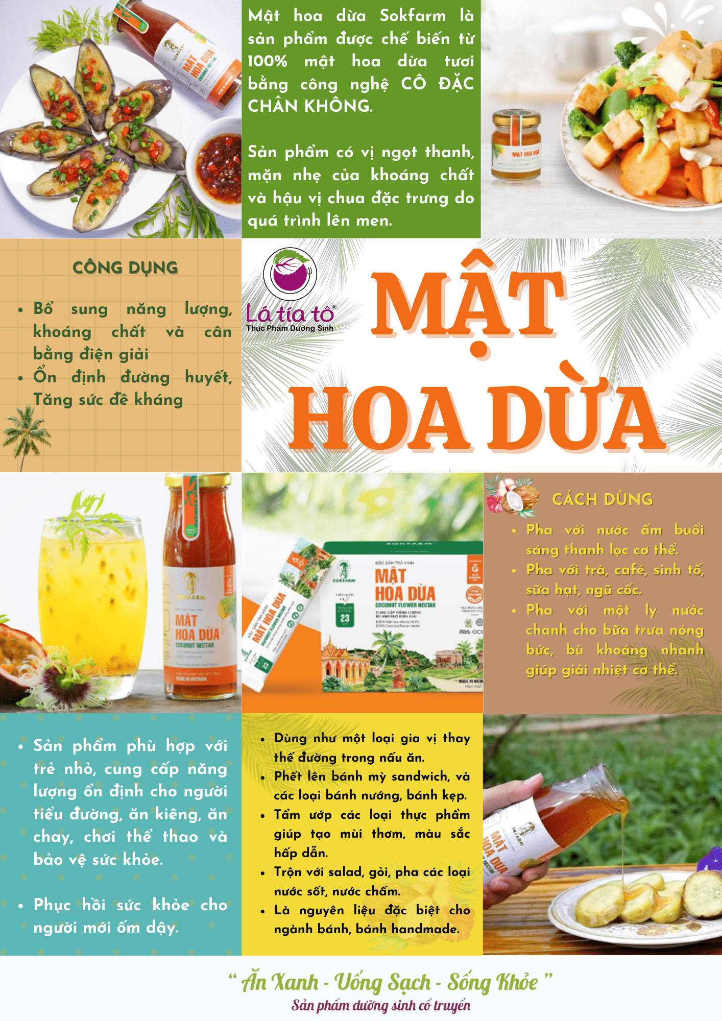Mật hoa dừa hữu cơ Sokfarm là vị ngọt mới từ dừa. Sản phẩm được thu thủ công bằng kỹ thuật mát-xa hoa dừa và thu mật truyền thống của người Khmer Trà Vinh và ứng dụng công nghệ chế biến ở nhiệt độ thấp. Mật hoa dừa nguyên chất 100%, giàu dinh dưỡng và khoáng chất tự nhiên, đặc biệt đây là đường hấp thu chậm tốt cho sức khỏe, cả gia đình an tâm sử dụng.