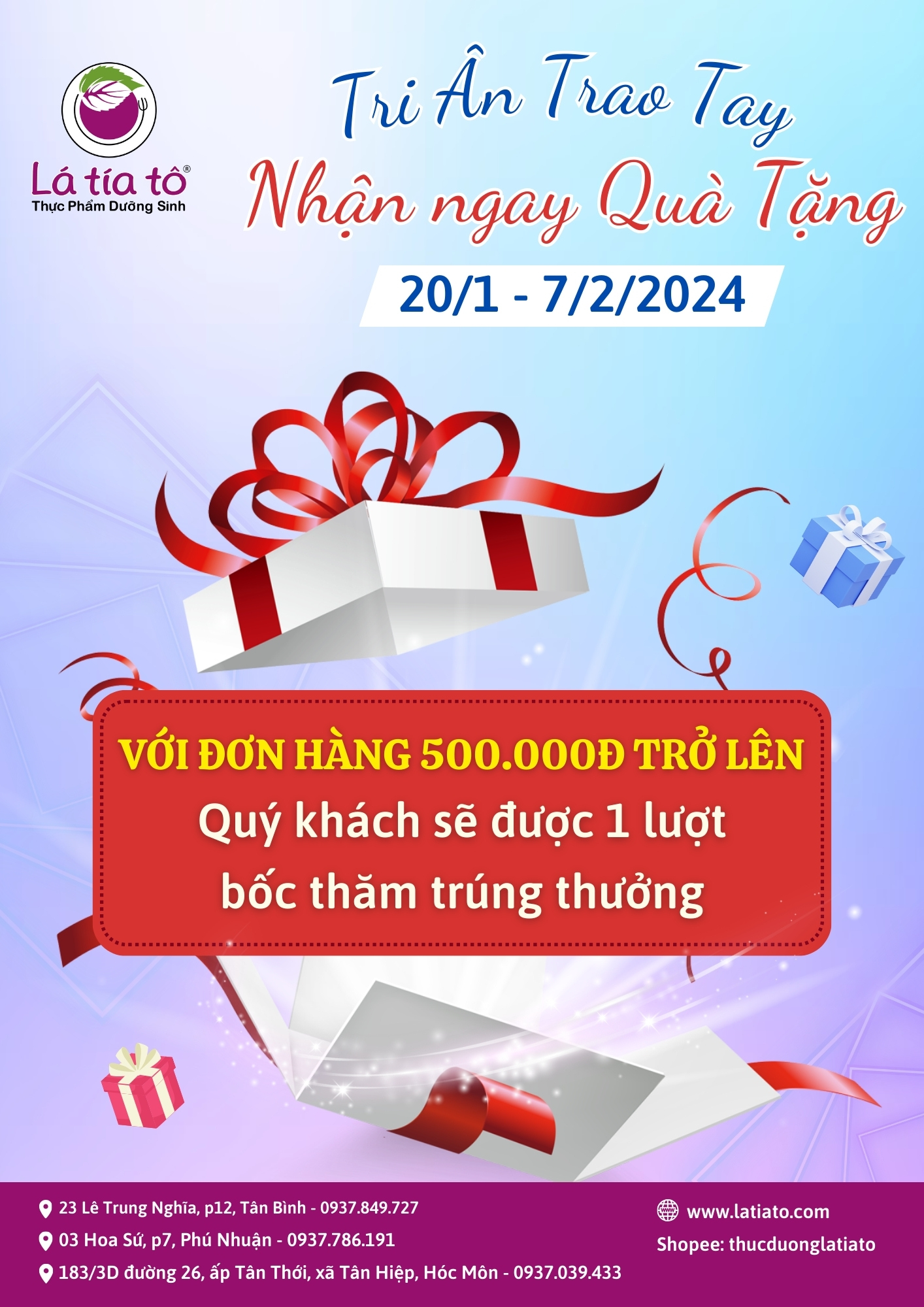 Chương trình “Bốc thăm trúng thưởng” sẽ thay cho lời cảm ơn của Lá Tía Tô tới Quý khách hàng. Với rất nhiều phần quà hấp dẫn dành tặng riêng... muốn gửi tới Quý khách hàng những lời cảm ơn sâu sắc vì đã ủng hộ và đồng hành cùng Lá Tía Tô trong suốt khoảng thời gian vừa qua.
