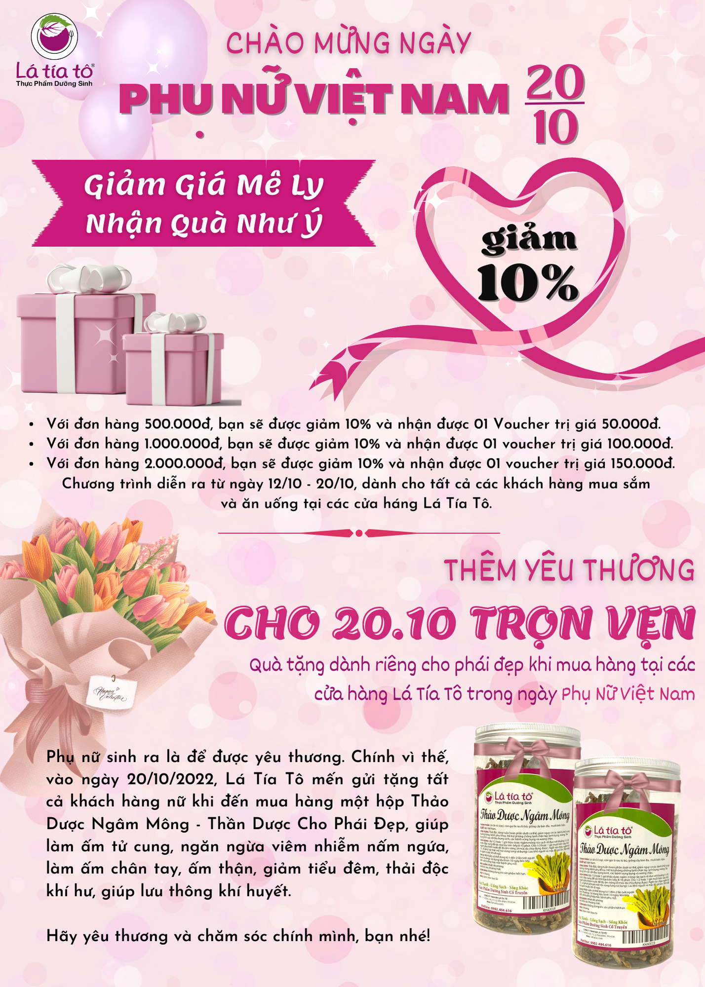 Còn phụ nữ sinh ra đã là một món quà tuyệt vời rồi. Thế mới biết lý do tại sao một năm có đến hai ngày đặc biệt dành cho phái đẹp. Vì vậy, Lá Tía Tô ưu ái dành tặng các chị em phụ nữ và cả luôn các đấng mày râu cơ hội được chăm sóc những người phụ nữ của mình chương trình ưu đãi đặc biệt sau đây: